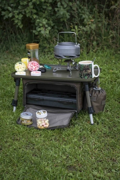 De Bivvy Organiser maakt het je mogelijk om je materiaal georganiseerd en overzichtelijk op te bergen. De tafel is voorzien van een stroef tafelblad en beschikt over een handige, ingebouwde tas waarin ruimte is voor allerlei accessoires, telefoon en autosleutels. Met een ingebouwde houder voor een gasfles, dat de fles vrij van de bodem houdt, is deze tafel ook een uitstekend kookstation.