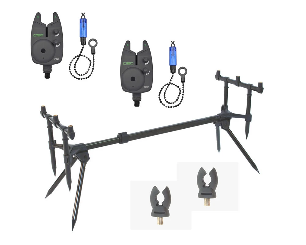 Onze eigen De Sportvisser Rod Pod maar dan compleet geleverd als set.. Deze rod pod is geschikt voor 3 hengels. De buzzerbars zijn in hoogte verstelbaar, zo kunt u zelf bepalen hoe hoog u uw hengeltoppen kunt zetten. De middenbar is in lengte te verstellen zodat u altijd uw hengels naar wens neer kunt leggen. Wordt geleverd in een draagtas. Compleet met 2x Spro C-Tec beetmelder, 2x Spro C-Tec Hang-Indicator, 2x Rubber Back rest.