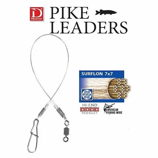 Meerval, Snoek-Snoekbaars onderlijnen. Gemaakt van top kwaliteit staaldraad American Fishing wire Surflon. De Dragon AFW Surflon 7×7 Spinning leaders zijn uiterst soepel en hebben een gladde nylon coating die er voor zorgt dat deze onderlijnen een hogere kink weerstand krijgen en zal daardoor langer meegaan.