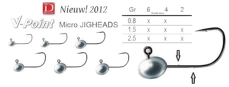 De DRAGON V POINT MICRO JIGHEADS zijn voorzien van een Mustad carbon haak deze zijn super sterk en hebben een scherpe haakpunt.
