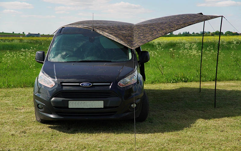 Perfecte bescherming tegen regen en zon. Diverse functies, zoals bescherming van aas en verlengen bivvies en kooktenten. Khaki laminaat reduceert penetratie licht. Volledig waterdicht. Lichtgewicht en compact in transport. Versterkte hoeken met zeilringen voor stormkoorden. Geleverd met twee inklapbare stormpoles. Inclusief draagtas met haringen en stormkoorden. 100% Polyester. 430x345x200cm.