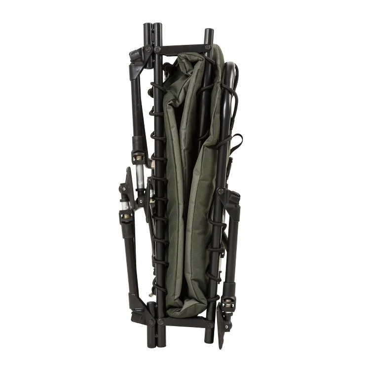 Dubbel scharniersysteem om een flatbed systeem op te zetten en na opvouwen ruimte te creëren voor een slaapzak die tijdens transport aan de bedchair vast blijft zitten