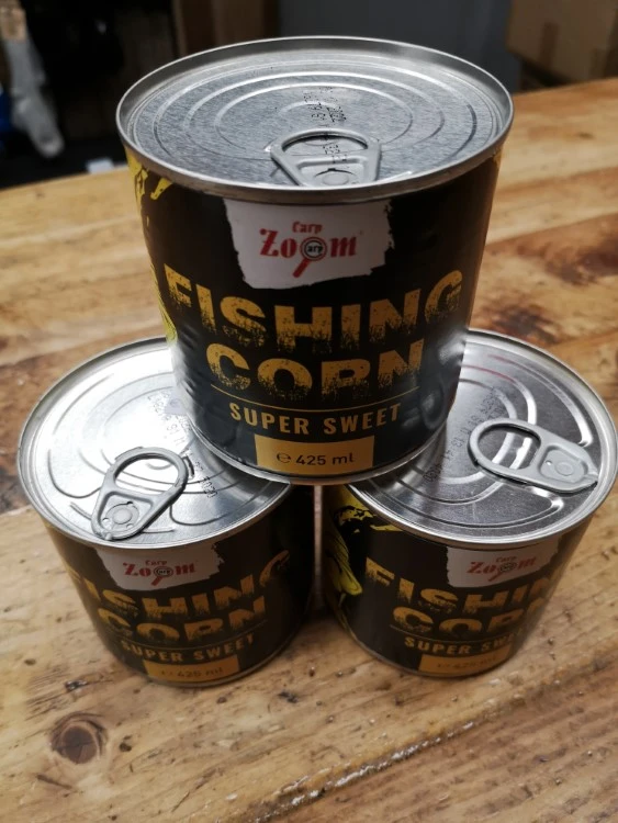 Klein blikje mais van het merk Carp Zoom. Deze mais is niet voor menselijke consumptie door de zoetstoffen die zijn toegevoegd.
