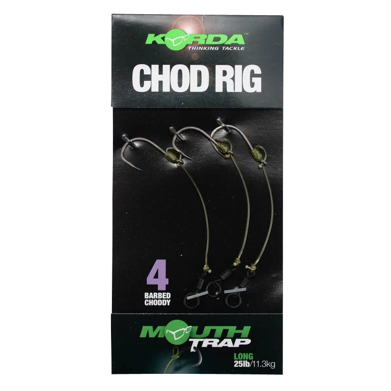 Deze gebruiksklare rigs zijn samen gesteld uit de beste Korda componenten zoals de Choddy haken, Mouth trap, Rig Rings en Ring Swivels. Doordat deze rigs zijn voorzien van een perfecte curve, wordt de inhaking sterk verbeterd. Je hoeft alleen nog maar een boilie te monteren en klaar is de perfecte chod-rig.