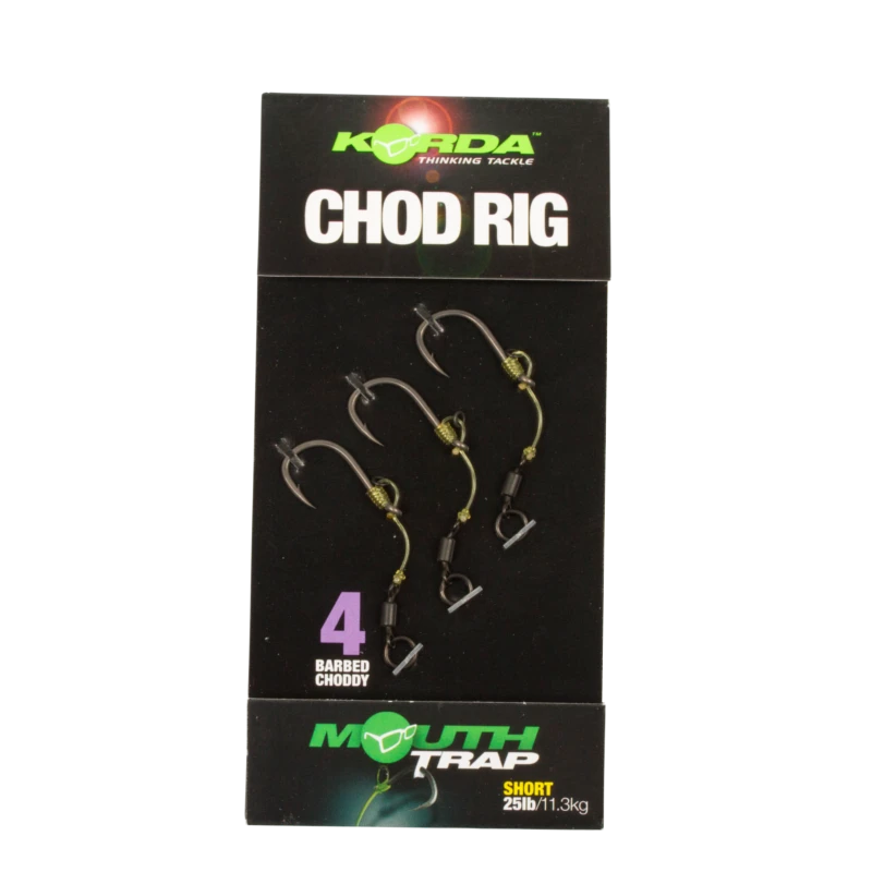 Deze gebruiksklare rigs zijn samen gesteld uit de beste Korda componenten zoals de Choddy haken, Mouth trap, Rig Rings en Ring Swivels. Doordat deze rigs zijn voorzien van een perfecte curve, wordt de inhaking sterk verbeterd. Je hoeft alleen nog maar een boilie te monteren en klaar is de perfecte chod-rig.
