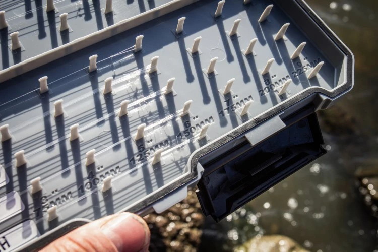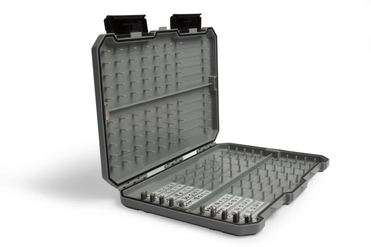 De All-Round Hooklength Box is ideaal voor het bewaren van grote aantallen onderlijnen in lengtes vanaf 7,5 tot 22,5 cm. De capaciteit is aanzienlijk, de doos is voorzien van pennen waarop tot maximaal 20 haken een plaatsje kunnen vinden. Er zijn 20 beschikbare plekken voor onderlijnen tot 22,5 cm lang en 40 posities wanneer de onderlijnen 7,5 of 10 cm lang zijn; dit betekent dat de doos ruimte heeft voor maximaal 800 onderlijnen van 7,5 of 10 cm. De pakking helpt voorkomen dat er water de doos in kan dringen, deze wordt verder afgesloten met twee clips en extra magneten aan de zijkanten. De doos is geconstrueerd van ultra-duurzaam ABS plastic en heeft gefixeerde pennen die perfect gepositioneerd zijn en die je niet in de steek zullen laten. Elk type onderlijn kan duidelijk aangegeven worden met de meegeleverde labels.