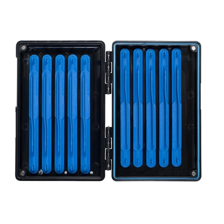 Het Mag Store Systeem gebruikt magneten om iedere individuele Rig Stick in de box te plaatsen. (8-10 Rig Sticks worden met het systeem meegeleverd, afhankelijk van de maat. Hierdoor is het mogelijk om de indeling in de box gemakkelijk te veranderen en per vissessie te kiezen welke onderlijnen er mee moeten.