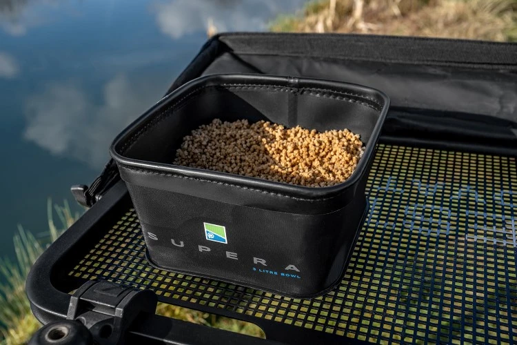 Een handzaam formaat voerbak voor grotere hoeveelheden los voer, aanzienlijk groter dan een aasdoos maar compact genoeg om nog gemakkelijk op een aastafel geplaatst te kunnen worden.