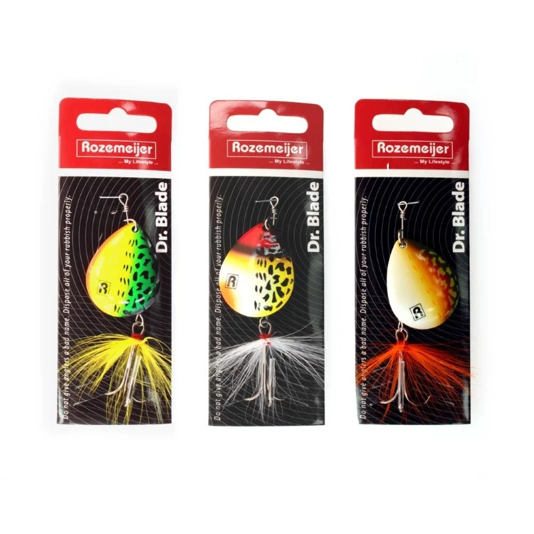 Spinners, wie is er niet mee begonnen in de polder of in zijn lokale visvijver? Spinners zijn nog steeds helemaal hot en vangen absurd veel roofvis, van baars tot snoekbaars en van snoek tot roofblei. Wij van Rozemeijer weten dat als geen ander en hebben nu deze serie spinners ontwikkeld; Dr Blade! Te verkrijgen in verschillende maten blad (#3 – #4 – #5) en in 3 schitterende kleuren: Speckled Fire Tiger (SFT) / Speckled Red Head (SRH) / Speckled Hot Pike (SHP). Deze spinners wegen 6,5 gram