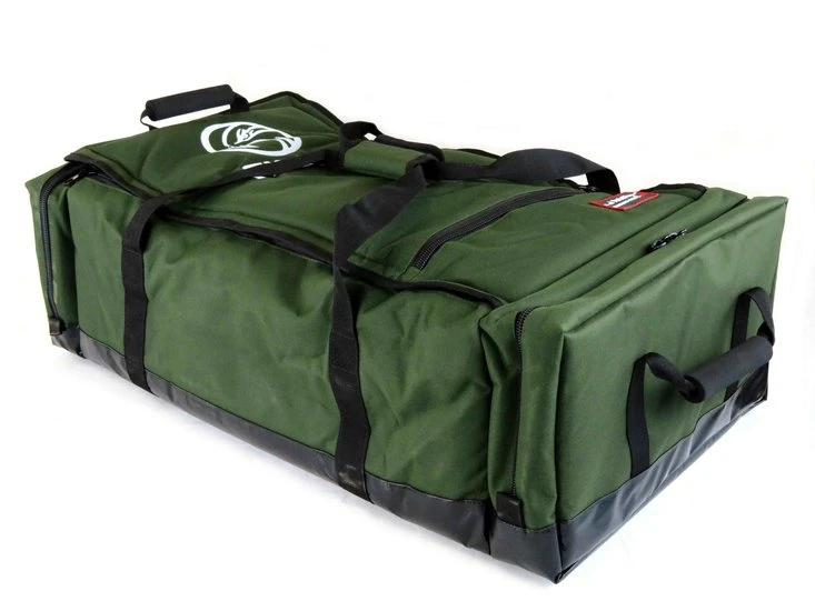 Aan extra opbergruimte is ook gedacht, aan de linker en rechterzijde zijn 2 grote opbergvakken te vinden. Deze zijn af te sluiten met een rits. Deze opbergvakken kunt U onder andere gebruiken voor o.a. uw handzender, fishfinder, voerboot accu’s, handzender batterijen of andere kleine materiale. Op de bovenkant van de tas zit een handig groot opbergvak (bijna over de volledige lengte van de tas), welke U kunt sluiten met een rits.