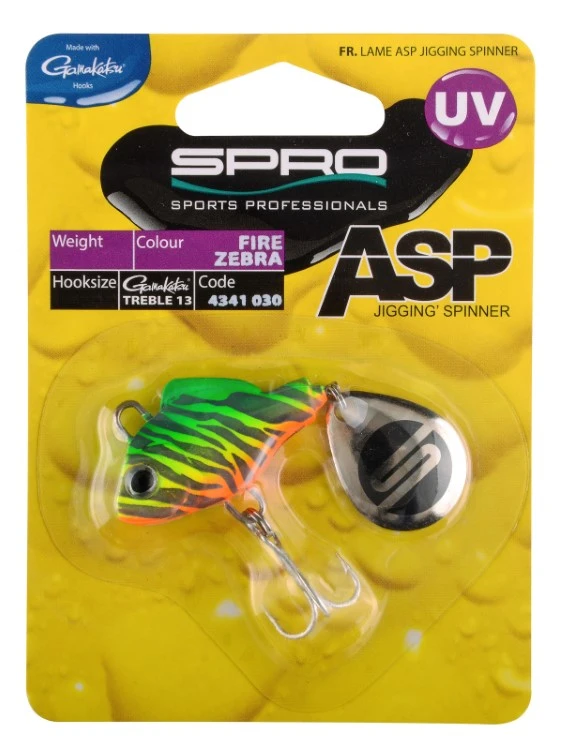 Het enige echte origineel! De Spro ASP spinner is nu eindelijk verkrijgbaar in een volledig UV kleurenpalet voor nog meer aantrekkingskracht! De ASP spinners zijn bijzonder populair vanwege het enorme werp bereik en de hoge inhaalsnelheid waarmee dit kunstaas zich laat vissen. ASP spinners zijn effectief bij het vissen op roofblei, maar staat eigenlijk altijd zijn mannetje voor nagenoeg alle soorten roofvissen. Zo zijn er tal van grote meervallen met dit kunstaasje gevangen. Vanzelfsprekend uitgevoerd met een topkwaliteit Gamakatsu dreg. Onder de nieuwe UV kleuren is zelfs een speciale ‘glow’ versie; genaamd ‘firefly’!
