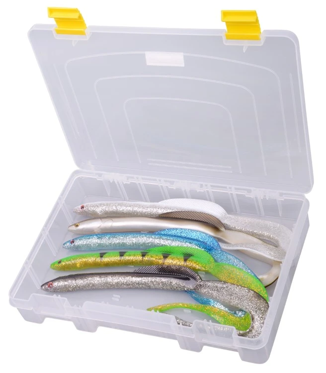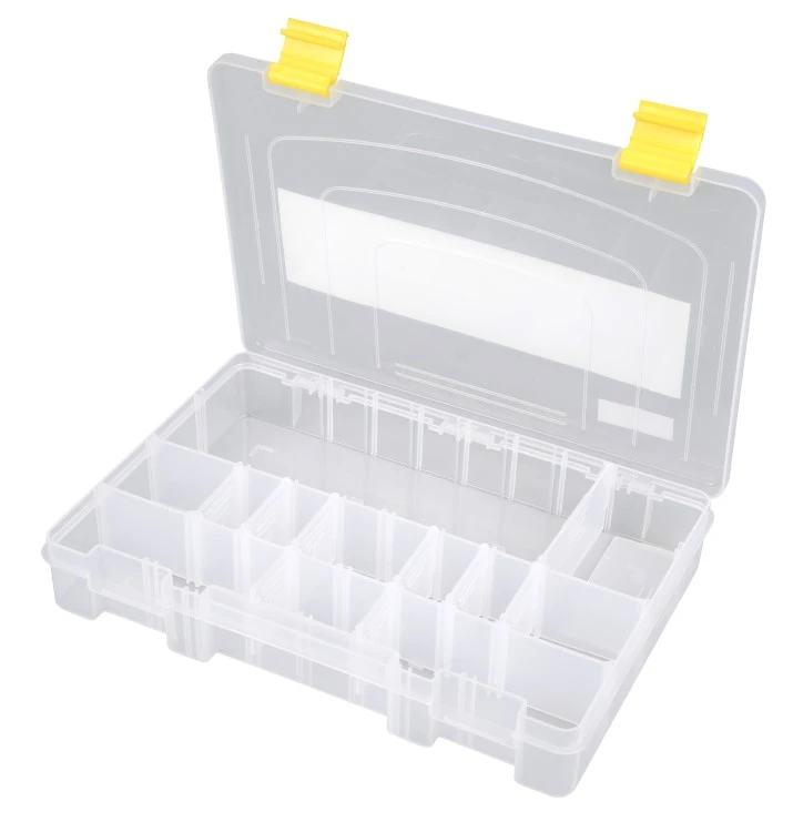 Deze tacklebox biedt de mogelijkheid om alle dividers eruit te halen en een lege ruimte over te houden voor allerhande accessoires. Wordt geleverd zonder inhoud.